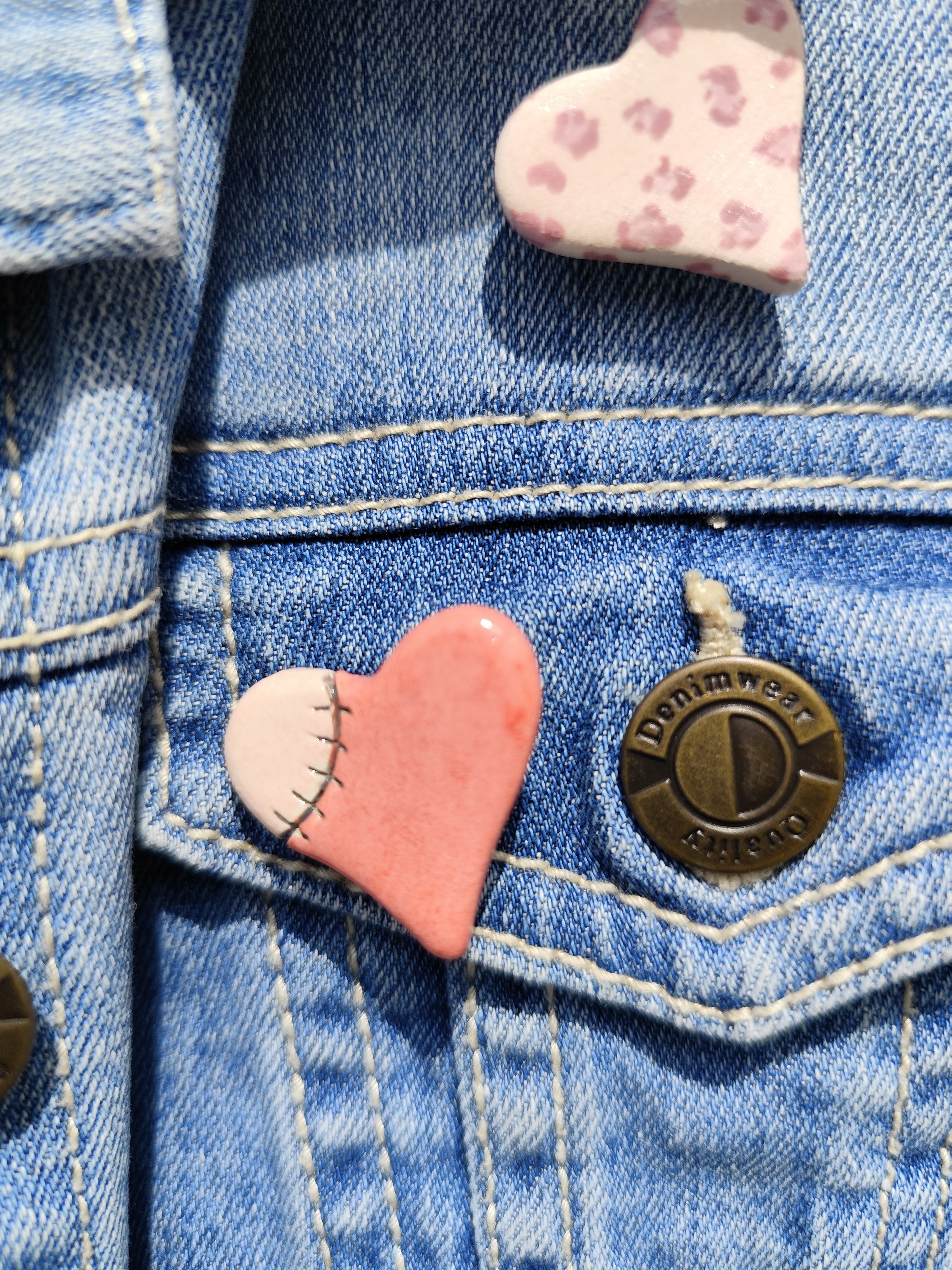 Toutes les broches que je fabrique sont des modèles uniques ou faites en toutes petites séries. Elles sont créées avec de la terre à faïence blanche cuite à 2 reprises entre 980° et 1030°. Je les découpe à l'emporte-pièce pour certaines et d'autres manuellement. Chacune d’elles est décorée au pinceau avec de l'engobe coloré puis recouverte d’un émail transparent non toxique. L’attache au dos est de couleur argentée et fixée avec une colle spéciale forte.