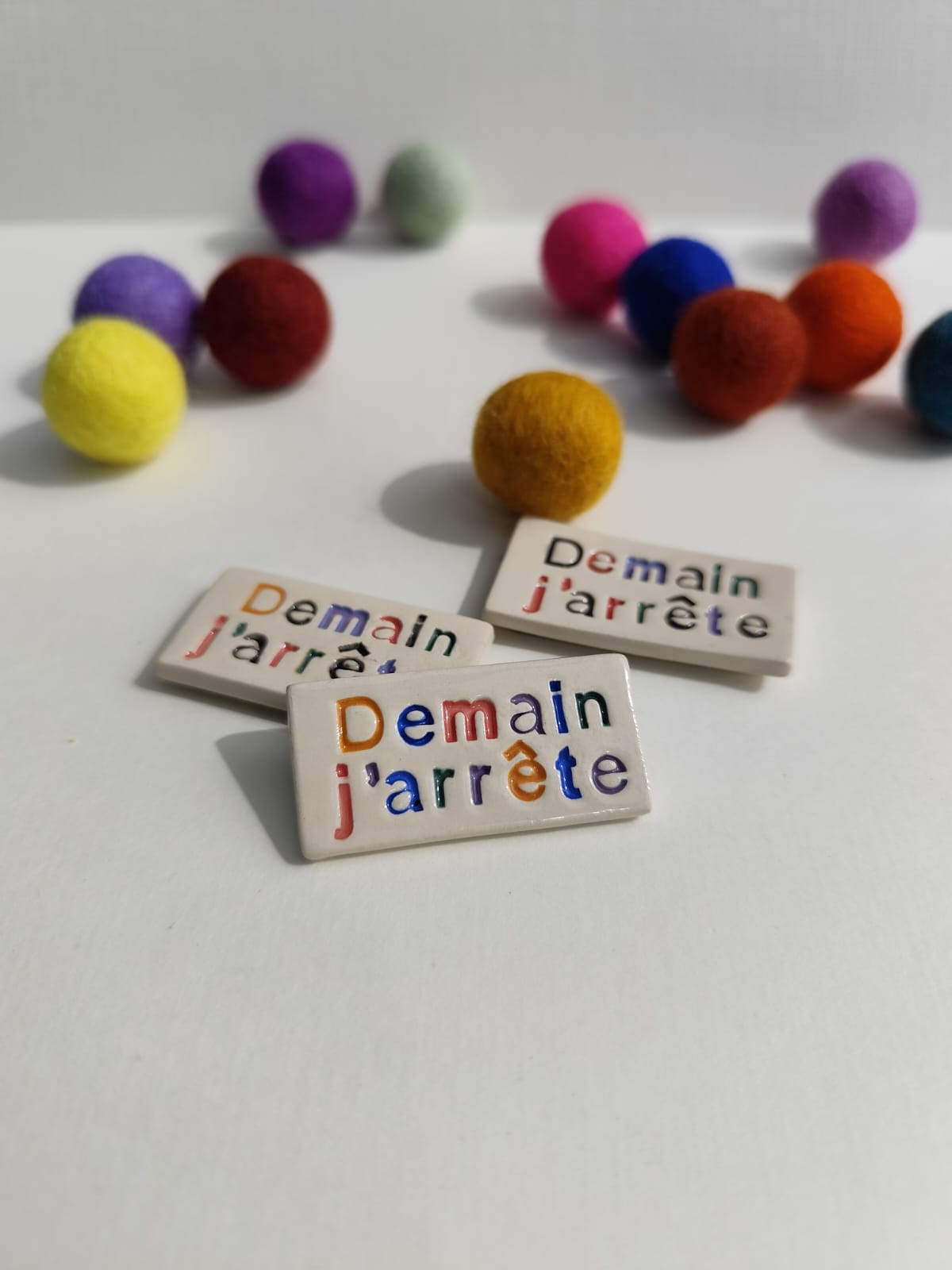 Tous les aimants que je fabrique sont des modèles uniques ou faits en toutes petites séries. Ils sont faits avec de la terre à faïence cuite à 2 reprises entre 980° et 1030°. Je les découpe à l'emporte pièce pour certains et d'autres manuellement. Les lettres sont incrustées une à une et remplies avec de l'engobe de couleur puis le magnet est recouvert d'un émail non toxique. L'aimant au dos a été découpé à partir d'une plaque de 1.2mm. Il tient solidement sur des surfaces comme le frigo!