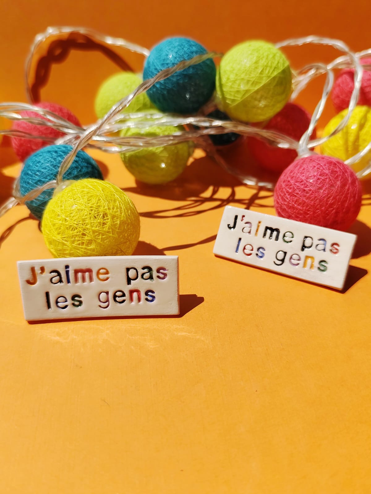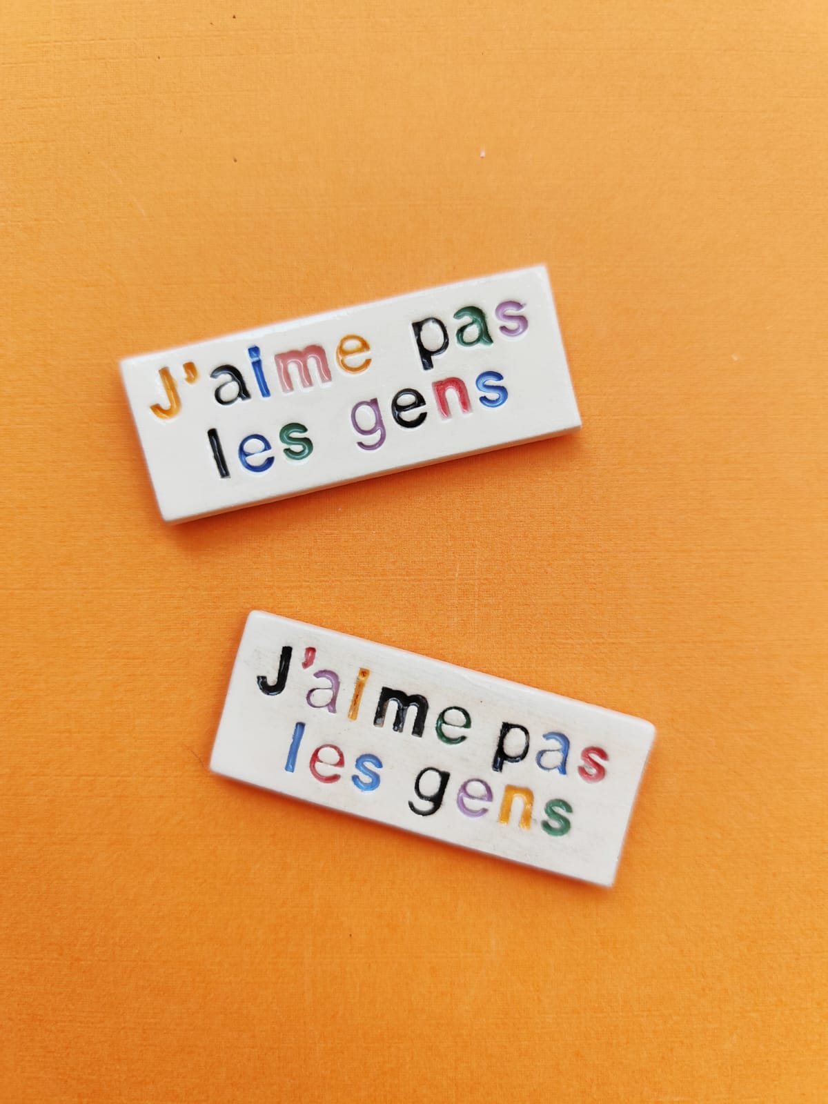 Tous les aimants que je fabrique sont des modèles uniques ou faits en toutes petites séries. Ils sont faits avec de la terre à faïence cuite à 2 reprises entre 980° et 1030°. Je les découpe à l'emporte-pièce pour certains et d'autres manuellement. Les lettres sont incrustées une à une et remplies avec de l'engobe de couleur puis le magnet est recouvert d'un émail non toxique. L'aimant au dos a été découpé à partir d'une plaque de 1.2mm. Il tient solidement sur des surfaces comme le frigo!